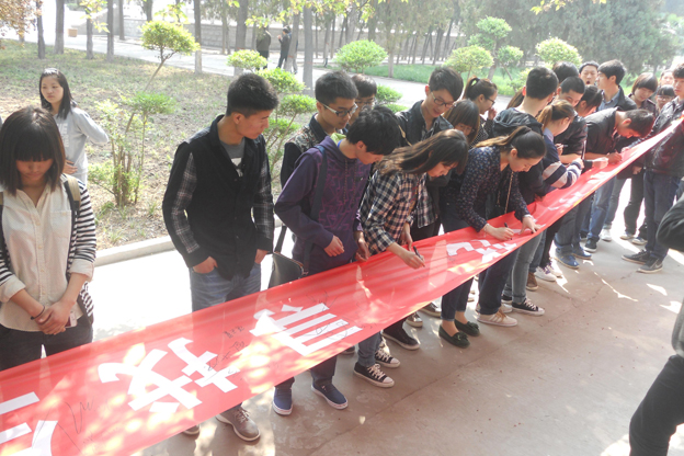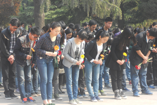 十点整,缅怀大会正式开始,激昂的红歌响起,那曾染着革命烈士鲜血的红旗被志愿者高高举起。胸戴白花,手拿鲜花,学生们在纪念碑前庄严肃穆,为英雄烈士敬献花圈及鲜花,全体默哀一分钟。接着,校学生会团支书冯宇、主席佑路标分别发言,号召同学们“缅怀革命先烈、争做时代先锋”。最后,全体同学向革命烈士庄严宣誓,以此来告慰先烈的灵魂,接受心灵的洗涤。