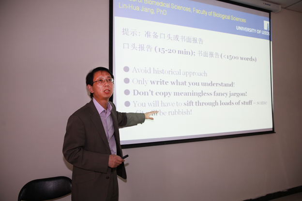 江林华博士以英国利兹大学为例,详细讲解了英国大学本科生的教学方法与能力培养情况,多次将英国的教学方法与我院作比较。他说,我国与英国大学生能力培养最大的不同是英国更加注重学生的自主性与合作性。他们在教学中将学生平均分配给各个导师,每位导师带20名学生,这20名学生再分为5组,每组4人。导师将选定的课题交给学生,导师指导学生2小时,每个小组自学8小时后收集、整理、讨论材料。然后一人准备口头报告,一人准备书面报告,其他两人协助准备。下一个课题再将工作调换一下,保证每个学生都能参与其中。