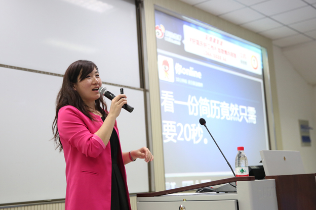 讲座开始,朱峰用诙谐幽默的语言引出本次讲座的主题–-《简历特训》。首先,她根据事先发放到同学手中的简历进行讲解,说明同学们简历上常犯的错误,以及怎样写简历才能给自己赢得更多的面试机会。然后,通过一个具体的简历告诉大家简历应具有的特点,例如,如何根据不同的应聘岗位显现其不同的侧重点,如何用20秒的时间抓住应聘官的眼球等。接着,她还引用“今年过节不收礼,收礼只收脑白金”、“去屑就用海飞丝”、“怕上火喝王老吉”等品牌广告语阐明了打造自己职业品牌的重要性。