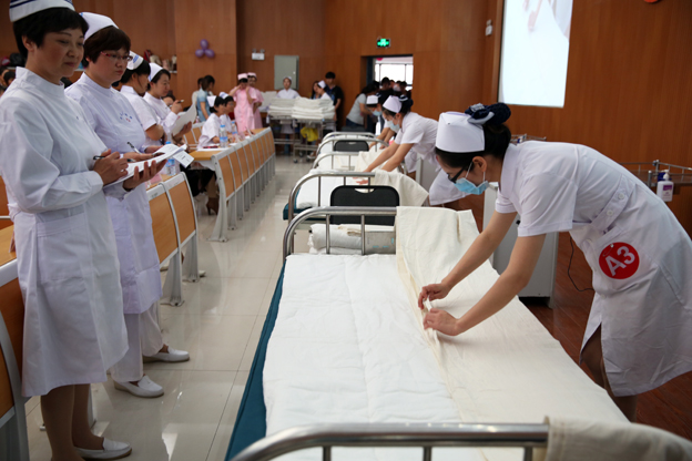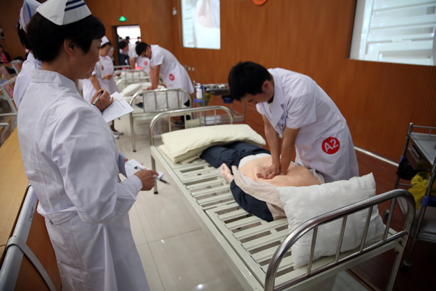 参赛选手们以一首诗朗颂《2014,我们的梦想》拉开了大赛的帷幕,表达了护理工作者无私、仁爱、奉献的高尚道德情操和将继续沿着南丁格尔精神做一名优秀白衣天使的决心。大赛分技能操作和情景展示两个部分。采取分组竞赛,三人一组,共分A—F六组。比赛项目分别为铺床法,密闭式静脉输液法,单人徒手成人心肺复苏法。选手们以抽签的形式选择操作内容,并在规定的时间内,完成操作。在心肺复苏操作项目中,男选手们以娴熟的手法、强劲的力道为现场营造了一个真实的抢救氛围,其精彩的表现让在场的同学惊叹不已;在铺床术中,选手们更是以精炼的技术和人文关怀赢得评委老师们的肯定;在进行密闭式静脉输液操作项目比赛中,模拟对象采用真人注射,当现场观众看到每位选手一针见血地扎入手臂静脉后,现场一片惊叹唏嘘之声。整个比赛过程,各参赛选手凭借他们娴熟的操作技术,熟练的解说,将扎实的护理技能操作展现给大家。评委老师亲临选手身旁,细心观察,严格打分。在现场同步录播设备的近景直播下,选手们的各个操作细节一览无遗,精彩的表现赢得了现场一次又一次掌声。期间,模拟情景短剧《男护的邂逅》以幽默轻松的格调,缓解了比赛紧张的气氛,不但展示了作为一名男护理良好的精神风貌、扎实技能,同时展示了男护士们独特的个人魅力和人文关怀。