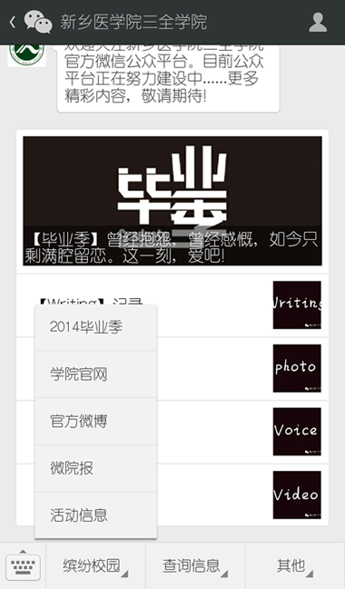 又是一年毕业季,在这充满躁动的时节,2014届即将毕业的你将要迎来自己一生中重要的时刻之一,或惶恐不安,或信心满满,心中自然也是五味杂陈,太多的心情无处释放。此刻,你一定想在这最后的时间在自己母校留下属于你自己的印迹,现在就为大家提供了这样一个展示自己的平台,我们将在校级官方微信平台最新开辟的“2014毕业季”栏目推出【Writing】、【Photo】、【Voice】、【Video】四个姊妹活动无论你选择哪种方式,无论你释放多少激情,2014毕业季,期待,最爱的三全,最美的你。