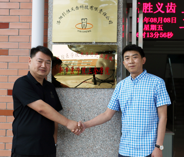 最后,在热烈的掌声中,王洪兴与洛阳引胜义齿科技有限公司董事长许引胜共同揭牌,两人握手互贺,希望以此为契机进一步加强双方合作。
