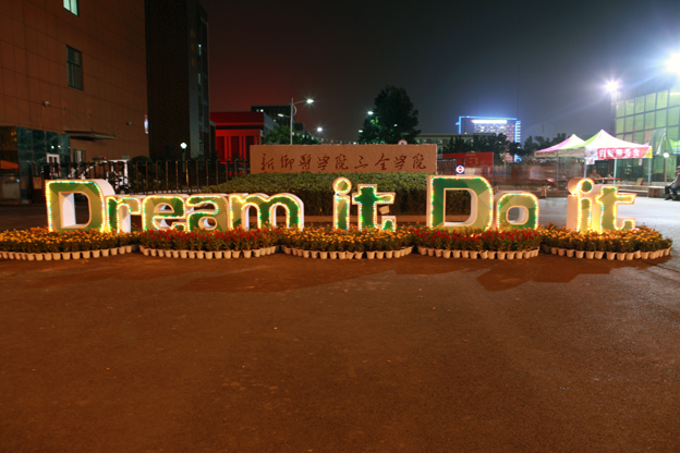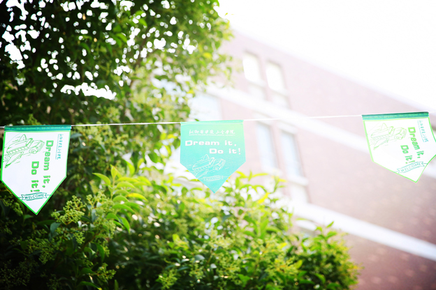 新乡校区大门口,“Dream it,do it!(有梦就去追)”这句充满青春激情的主题标语吸引了众人的目光,成为今年学院迎新的一道亮丽的风景线。校园主干道上空飘扬着绿白交替的小彩旗,象征学子们青春的梦想;迎新广场四周喷绘,刊载了多条学校对新生的寄语,多幅校园照片把新生引入多彩的大学生活。