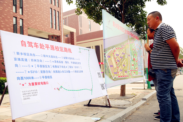 今年学院选派100余名教师和400多名学生志愿者,设新生资格审查处、签到处、咨询处、行李寄存处、家长休息室等服务点。校门口有新乡校区平面图、报到流程图,路边设大学生防盗防骗安全须知、驾赴平原校区路线等指示图。各种图示一目了然,为新生报到提供了全面、贴心的服务。学院的官方网站,官方微博、微信也及时发布迎新信息,方便新生顺利报到。
