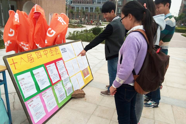 十八届四中全会明确提出了全面推进依法治国的总目标、重大任务,作出了一系列关于全面推进依法治国的新论断、新部署。为下一阶段坚持拓展中国特色社会主义法治道路,完善中国特色社会主义法律体系奠定了坚实基础。翔实的图文资料加上生动形象的讲解吸引了一大批师生驻足观看。同时,崇德书院党总支组织并号召各支部召开党员大会共同学习十八届四中全会会议精神。崇德书院党总支书记徐超表示,本次党情教育活动,意在使师生不仅从多方面、多层次认识、理解十八届四中全会的会议精神,更是从精神上深刻领悟当前“法制”二字对我党、我国的指导意义,同时此次活动也为当前阶段增强我院师生的爱党爱国意识、发挥党建热情提供了力量支撑。