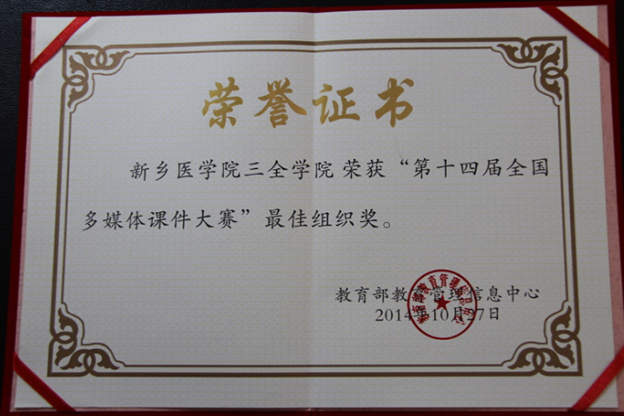 11月10日,第十四届全国多媒体课件大赛颁奖典礼在北京举行,我院被授予最佳组织奖,我院副院长王洪兴被评为第十四届全国多媒体课件大赛先进工作者。至此,我院已连续三年荣膺全国最佳组织奖,是全国唯一获此殊荣的独立学院、全省唯一获此荣誉的高校,也是本届全国大赛河南省获奖率(40%)最高的高校。