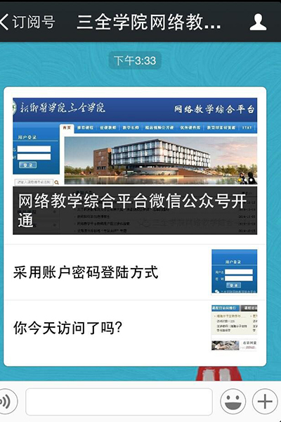 关注此微信,你可以看到通知公告、资源建设更新资讯、教师课程更新资讯、优秀课程推荐、各院系课程最新进展、名师视频推荐、获奖课件展示、题库更新、在线测试通知等内容,并且还可以与老师线上对话。