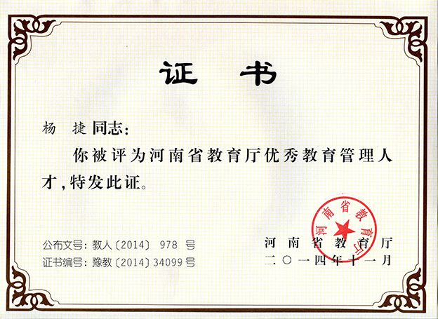 11月28日,河南省教育厅发布了《关于公布河南省教育厅优秀教育管理人才评选结果的通知》,我院院长杨捷成功入选,获得“河南省教育厅优秀教育管理人才”荣誉称号。