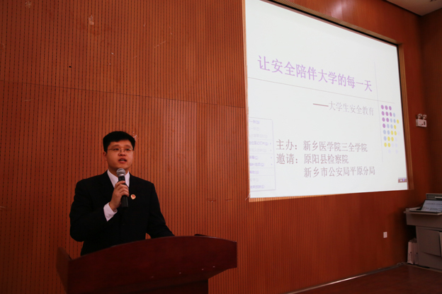 在第一教学楼D2大教室,原阳县人民检察院葛二磊警官针对社会安全问题进行剖析,就诈骗、暴恐问题进行了法制知识普及,随后,新乡市公安局平原分局夏杰警官针对大学校园内常见的网络安全、防诈骗进行了阐述。