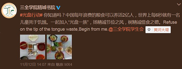 为进一步落实团中央《关于在大、中学校学生中广泛开展“光盘行动”主题活动的通知》的要求,响应团中央学校部号召,11月12日至12月10日,我院进行了为期近一个月的 “光盘行动”之“舌尖上的节约”倡导活动。此活动由我院团委主办,校学生会承办。
