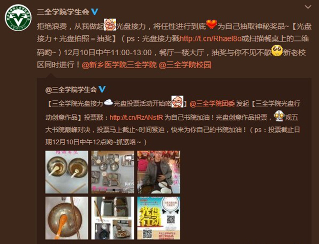 此次活动分为线上线下两种形式。11月12日起,同学们陆续以微博接力的形式晒出自己的“光盘”作品,并为自己钟爱的作品投票,最终,每个书院诞生各自最有创意的作品;线下活动主要是同学们扫描餐厅饭桌上的“光盘行动”二维码,加上自己的“光盘”照片参加抽奖活动。