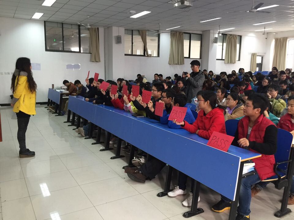 本次活动以小班为单位进行,在演讲时由另外班级五名学生组成评审团,按照主题内容、语言表达、形象风度等标准对每一位演讲同学进行严格评定,当评审团给出的PASS牌少于三人时,判定为求职演讲不合格,需要重新准备并再次参加。