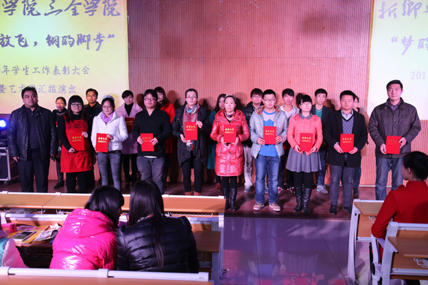 1月8日,院“梦的放飞,钢的脚步”2014年学生工作总结表彰大会暨艺术团汇报演出在平原校区第一教学楼D2大教室隆重举行。我院党委副书记王金文、张钢出席会议,学生事务发展部、教务部总务部等相关职能部门负责人,各书院党总支书记,以及教职工代表和获奖学生代表参加了本次大会。
