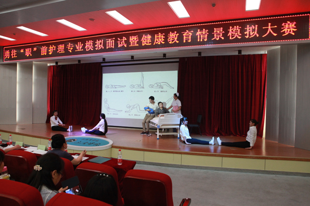 比赛分为自我推荐演讲、面试提问、健康教育情景模拟三个环节。在自我推荐演讲环节,选手们各具特点,将多才多艺的自己推介给各位评委。一二三团队田雨同学在面试提问环节中沉着镇定,回答问题一针见血,得到专家评委的一致好评。健康教育情景模拟环节是本次大赛的亮点,各团队利用自制的手绘图、健康教育手册、模拟人等道具间接扼要的向大家进行各类疾病的健康教育。同学们的剧本新颖,剧情紧凑,语言幽默,博得大家阵阵掌声。