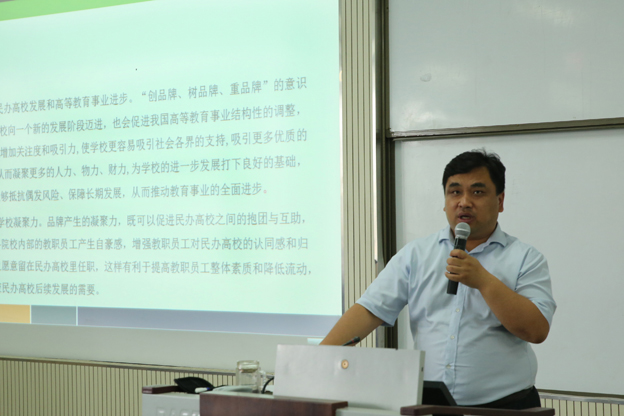 首先,张钢从我院提出的“一个导向,三大战略,四大支撑,五个坚持,六项转型”方针政策讲起。他从“品牌的内涵”、“为什么塑造品牌”及“品牌的作用”三方面进行了阐述。他指出品牌是产品的灵魂,塑造品牌可以带来额外的效益,同时品牌代表着竞争力,是一种重要的无形资产。他以美国新奇士橙由一个普通橙子成功“逆袭”的例子向我们阐述了他的观点。随后,他重点讲解了“学校品牌”这一内涵及其重要性,学校品牌的内涵是对学校精神、价值及价值观等方面的反映,他介绍了学校品牌的显性要素和隐形要素,说明了品牌建设有利于提高学校的知名度和美誉度,增强吸引力与辐射力;强化核心竞争力;推动民办高校发展和高等教育事业进步;增加学校凝聚力四个方面的意义。