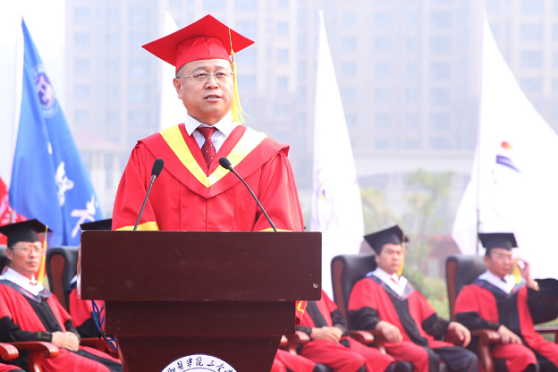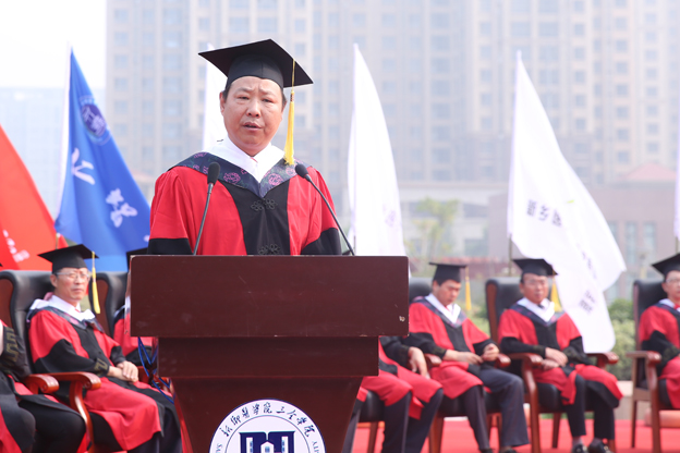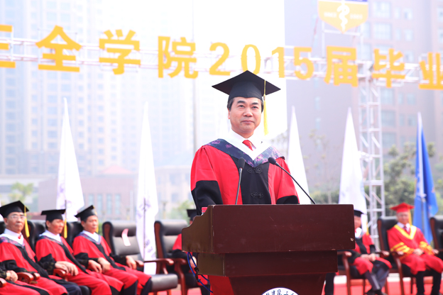 杨捷院长发表致辞。他向圆满完成学业的3660名毕业生表示热烈祝贺,向为学生成长付出辛勤劳动的全体教职工、始终关注并支持同学们成长成才的各位家长亲友和各界人士表示崇高敬意和衷心感谢。他带领广大毕业生回忆了多彩而难忘的大学生活,向他们提出三点希望和要求:第一,认清自我,找准定位。每个人都要弄清楚三个问题:“你是谁”、“你从哪里来”、“要到哪里去”,认清自己,对自己的能力和需求有全面、清醒的了解;审视自己,分析自己的优势和不足;拷问自己,看清楚自己究竟想要什么、想过一种什么样的生活,进而确定自己的理想和目标。只有这样才能最大程度地体现价值,实现梦想。第二,仰望星空,脚踏实地。没有梦想就没有激情,没有激情人生就失去了一大半的意义。习大大在《脱离贫困》一书中说:“我们需要的是立足于实际又胸怀长远目标的实干,而不需要不甘寂寞、好高骛远的空想”,希望大家牢记:万丈高楼平地起,千里征途脚下穷。第三,但行好事,莫问前程。他举了“老男孩”等例子,希望毕业生们能保持一个平常的心态,既不急功近利、患得患失,也不害怕路途遥远、前程渺茫,尽管一步一步的走下去,最后定能实现梦想。
