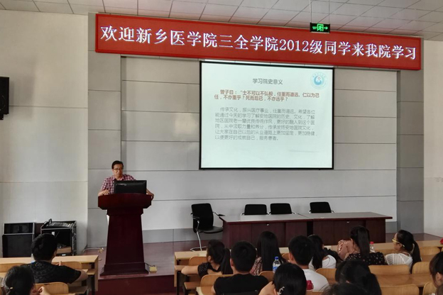 8月27日,我院安阳地区医院全过程教学基地2012级学生在医院东区第二教室迎来了新学期的第一节课,安阳地区医院党委副书记、院长贾朝京教授讲课。