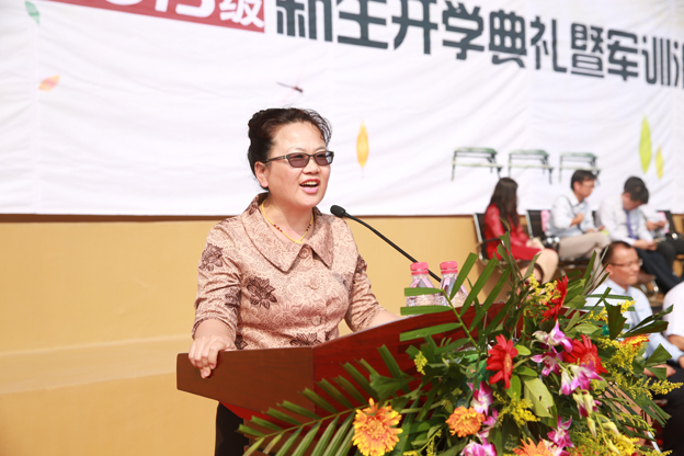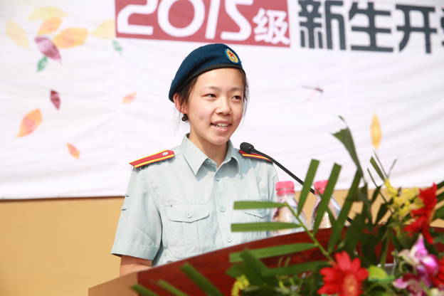2015级新生代表齐文秀发言。她讲述了自己的“三全初体验”:刚离开父母的忐忑,学长学姐们的热情,美丽的校园带来的惊喜。她憧憬未来的大学生活,表达了自己的心愿,她将尽快适应大学生活,明确奋斗目标,把“成为适应社会需要的医学英才”作为自己最大的理想。