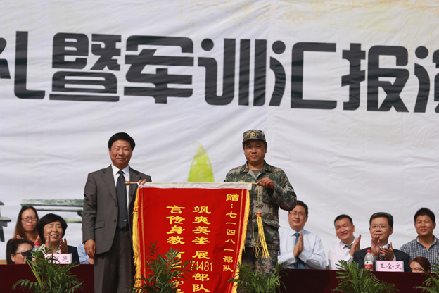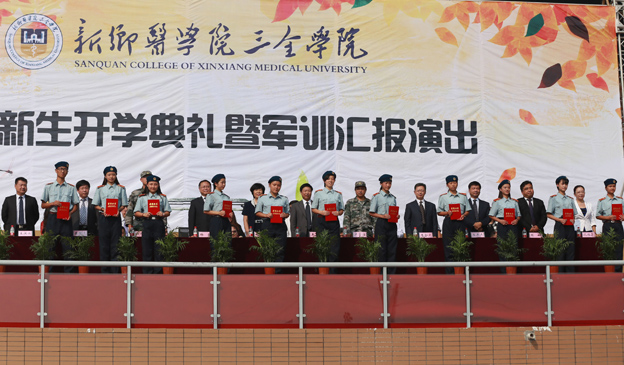 表演结束后,王金文宣读《新乡医学院三全学院关于表彰军训先进集体、先进个人的决定》,本次军训共有123名学员获军训优秀学员称号。出席领导为获奖者颁奖。王志凯代表学院向中国人民解放军71481部队赠送锦旗。