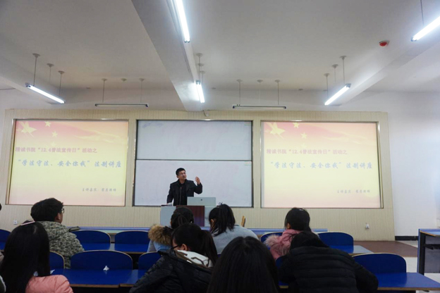 12月3日,在全国法制宣传日到来之际,精诚书院特别邀请了河南启轩律师事务所副主任翟彦律师,在平原新区教学楼A201为三百余名师生举办了一场“学法守法、安全你我”的法制讲座。