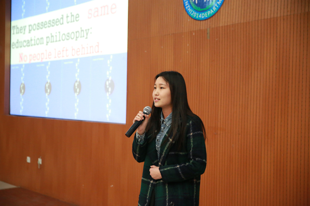 第一个环节是命题演讲,选手根据比赛规定的命题“When Socrates Meets Confucius”为主题,自由发挥。选手们采用孔子和苏格拉底之间可能发生的争论方式,由此来展开自己的演讲。情感与标准发音的融合给同学们带来了一种听觉上的享受。其中,五号范雅静以一口流利的英语,一副嘹亮的嗓音,以及自信的演讲博得了同学们的喝彩声;六号吴方更是以激情澎湃的演讲和高低起伏的音调征服了同学们的耳朵九号黄苏凡幽默风趣的演讲句子与精彩制作的PPT完美融合,更是一种美的享受。
