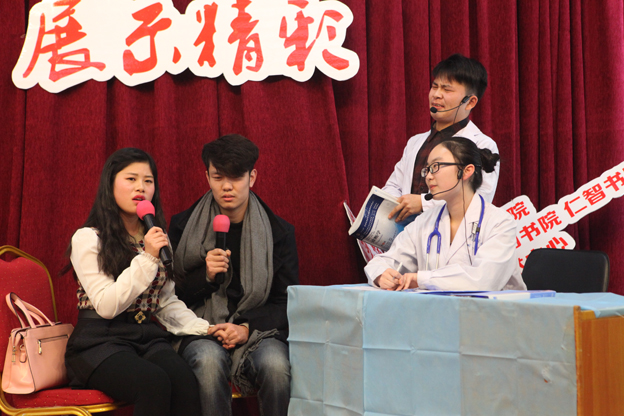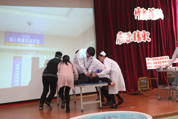 大赛首先进行的是三个单项技能操作,场面紧张而激烈,选手们满怀热情,沉着冷静,他们熟练的手法和严谨的态度赢得观摩学生一阵阵掌声。在临床情境模拟展示环节,《来自星星的肿瘤君》表现的是一个浪漫的爱情故事,当患者出现沮丧的情绪时,问诊医生清晰的问诊思路,淡定的态度以及对病人家属的安抚,都表现了良好的职业素养,给观众留下深刻的印象《奔跑吧,红包》展示一个紧急救援的案例。“来人啊,喊医生,推抢救车,心肺复苏,除颤仪”,选手半跪在心跳骤停的模拟病人面前,双指划过病人的胸腔,准确无误地落在心脏上方,选手的双手交叉,用尽全力对心脏进行快速按压,全场观众屏气凝息,紧紧盯着患者身上,当大屏幕上那道直直的线条变成曲线,听到心脏“咚咚”的跳动声时,会场瞬间沸腾,全场掌声雷动!在《医生,我得了癌症》的表演中,医生熟练地叩诊,准确地鉴别诊断,及时手术治疗,一切有条不紊,使患者很快康复恢复正常生活,展现出一个医术高超的医生形象。