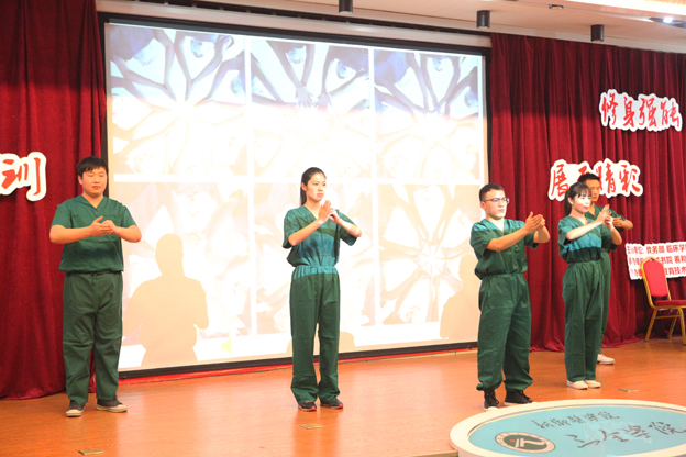 本次大赛历时两个多月,有1800多名学生报名,经过初赛、复赛,最终有8个小组30名选手进入决赛。大赛突出“以赛促教、以赛促训、修身强能、展示精彩”的主题,分两个环节范围涉及外总和诊断等多个项目。第一环节是单项操作分别是穿脱手术衣、戴无菌手套、腹腔穿刺术和心界叩诊术,第二个环节是SP标准化病人临床情景模拟剧展示。通过应用创新模具和标准化病人等高度契合临床实际情境,全面评判学生理论实践的结合能力