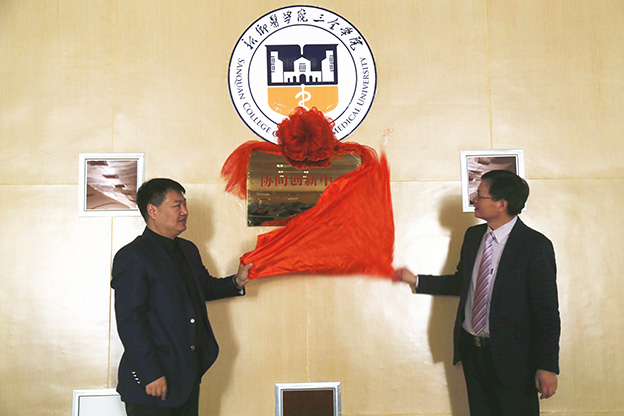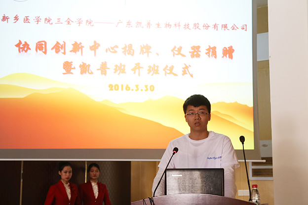 王金文和黄清桂向凯普班学生授凯普班胸牌,王洪兴与谢龙旭共同为协同创新中心揭牌。仪式最后,张树生代表凯普公司向我校捐赠了四台总价值67万余元的医用核酸分子快速杂交仪,杨文亮代表学院接受捐赠,并表示衷心感谢,希望双方进一步加强合作。