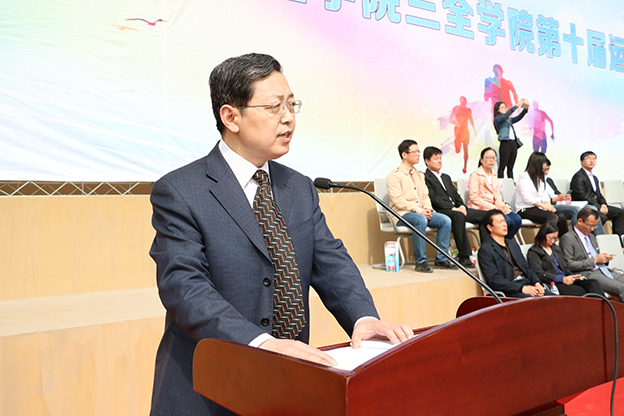 我院体育运动委员会副主任委员、本届运动会组委会副主任委员王金文为本次开幕式致辞。王金文说,经过十届的发展,体育运动已成为三全校园生活的重要组成部分,成为我院全面贯彻党的方针、实施素质教育、落实学校体育工作条例的重要体现。近年我院师生不断在各项大型运动会上取得优异成绩。王金文代表学院及大会组委会向运动员及参与筹备组织工作的师生表示感谢,他说,本届运动会是对我院体育运动水平的一次大检阅,是对学院群众性体育工作成果的一次检验,也是对广大师生员工竞争意识、团结精神、顽强意志的一次考验。他代表学院对参加本次运动会的全体运动员表达了深切的期望,希望运动员们赛出风采、赛出水平、赛出友谊;对于裁判员,他希望他们恪尽职守,本着“严肃、认真、公正、准确”的态度,严守规程,公正裁决,确保比赛工作顺利进行。王金文预祝本届运动会取得圆满成功!