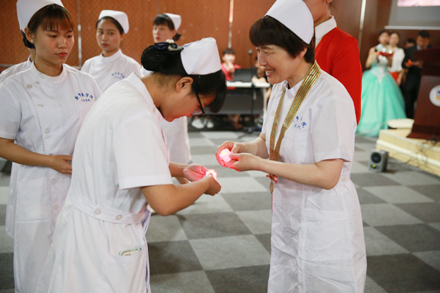 学院党委书记王志凯致辞。他向即将走向临床岗位的526名护理专业学生表示诚挚的祝福,愿他们能以扎实的护理技术、深厚的人文素质、勤勉的学习态度顺利的走入实习岗位。授帽仪式在庄重的《中国护士》乐曲声中开始。宋静主任将象征南丁格尔“燃烧自己,照亮别人”的火种传递到下一带护理人的手中,并与4位护理前辈一同为即将踏入临床的护生代表授帽,授帽结束后学生代表向老师敬献花束,向老师无私奉献和谆谆教诲致以深深的谢意。随后护理学院王静老师带领所有同学在南丁格尔画像前庄严宣誓。一句句铿锵有力的誓言在烛光中荡漾,萦绕在现场每一个人的心中,激励着同学们为护理事业奋斗终身。