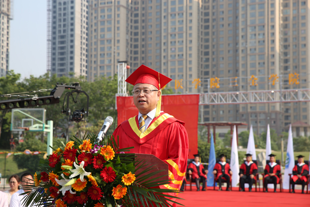 杨捷院长发表毕业致辞。他向圆满完成学业的3828位毕业生表示诚挚的祝贺,向为本届毕业生成长进步默默奉献的老师、家长致以崇高敬意和衷心感谢。他带领毕业生回忆了多彩而难忘的大学生活,向他们提出殷切希望:做一个平凡的人,一个简单的人,一个有格局的人。杨院长说,对于大多数人来说,平凡的日子将相伴一生。只要在自己的世界里,对人生充满希望,竭尽所能,发挥出自己的能量,就是成功!希望你们有独立的人格、独特的思维方式和自由的心灵。当你真正离开校园的时候,要做好接受平凡的准备。甘心平凡,拒绝平庸,这就是人生努力的全部意义。杨捷指出,人的一生,时间是有限的,青春更是要和自己赛跑。如果总在乎不必要的人和事,而不能享受当下这美好的青春时光,可能你真的会搭进你余下的一生。简单地生活,筛去我们不需要的物品、信息、欲望和朋友圈,留下最精、最好、最有意义的来打理、维护。杨捷说,做一个有格局的人,需要我们具有“家国情怀”和“担当精神”。像杨绛先生那样,不计较看似不公平的待遇,甘于过简朴的生活。挫折、失意和迷茫都是人生的必然过程,最重要的事情,莫过于确立自己努力的方向,找好自己的定位,踏实做事,认真做人。现在让你流汗、流泪的故事,在未来,一定会被你笑着把它讲出来。只要调整心态,就能为自己建立一个大的格局。