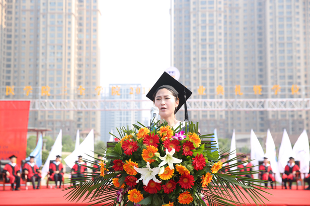 通过全院公开选拔进而赢得在毕业典礼上登台演讲机会的优秀毕业生代表何京发言。她表达了对母校老师的深深感谢和美好祝愿,引用梁启超先生的一句话“天戴其苍,地履其黄,纵有千古,横有八荒,前途似海,来日方长”向“全”世界告别。