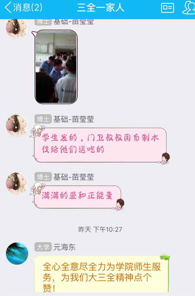 新乡校区,数十名教职工到公寓楼顶检查积水情况,到宿舍搬运学生物品。柴油水泵抽去公寓积水,皮筏运送学生及行李,后勤人员为学生发放食品和饮水,设法解决手机充电问题……全院总动员,抢险工作指挥有序,行动高效。防汛抗灾工作也牵动全院教职工的心,多个部门教职工在抢险现场相互配合,协同作战,第一时间沟通工作进展情况,校内QQ群、微信群等社交网络都围绕校园汛情的主题,群策群力,现场通报,点赞鼓励,一幅幅图片,一段段文字,饱含爱家的情怀和正能量。