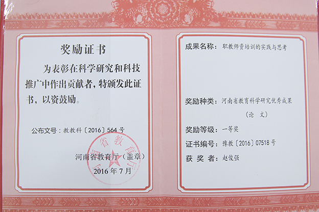 近日,河南省教育厅发布《关于公布2016年度河南省教育科学研究优秀成果的通知》,对评选出的优秀成果进行表彰,我院在此次评选中喜获佳绩。教育技术中心主任赵俊强的论文《职教师资培训的实践与思考》在此次评选中,获得一等奖,是我院此次参加评选获得的最高奖项。