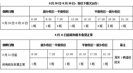 根据《新乡医学院三全学院根据《新乡医学院三全学院2016年迎新方案的通知》(院发〔201638号)的工作要求,829日、830日,迎新期间,各有关单位工作时间为7:00-1830,现将两校区通勤班车发车时间进行调整,有关事项通知如下: