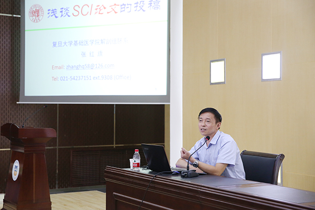 下午14:30,张红旗教授以“浅谈SCI论文的投稿”为题,为大家介绍了SCI、SSCI、EI等世界著名的文献检索工具使用方法、投稿杂志社的选择方法与投稿技巧。他指出,要重视投稿过程,投稿并根据编辑的建议修改文稿也是学习的绝佳时机。随后,他以自己对Telocytes细胞的发现与研究经历为例为医学生提供了科研指导。他说,医学本科生学习期间就应当发现自己的科研兴趣,保持对所学专业的专注度和好奇心,独立思考,选择自己对其研究方向感兴趣的导师,锻炼自己将研究结果整理成文并投稿发表的能力。张红旗结合我院实际,建议青年教师的科研要从临床实践中找灵感、找突破,鼓励大学生们本科期间开始重视科研并发表论文。