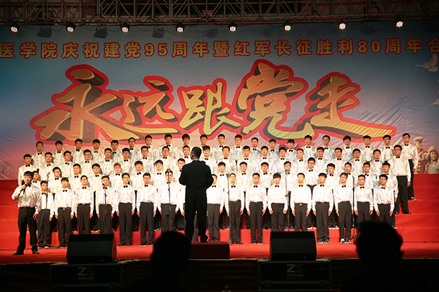 10月12日晚,新乡医学院“永远跟党走”庆祝建党95周年暨红军长征胜利80周年合唱比赛在体育馆举行。新乡医学院领导段广才、别荣海、陈兴华、郝红军、郭志坤、原志庆、张红彦、陈清江、王辉、刘国庚出席比赛并颁奖,学校各职能部门和院(系、部)负责人、职工和学生代表等近3000名师生共同观看了比赛。我院在此次比赛中荣获特等奖、优秀组织奖及最佳指挥奖。