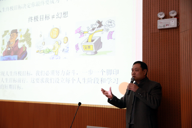 王现伟从“目标确立、自我定位、付诸实践”三个方面展开阐述。王现伟首先谈到目标确立的重要性,他表示人生规划首先要做的就是确立目标,若没有目标随波逐流,人生注定是失败的人生。他对如今大学生人生目标模糊不清,对大学生活抱着享受的现状做出具体分析,并对大学生如何树立人生目标提出建议。随后,王现伟论述了人生目标和实践密不可分的关系。他说,人生目标有终极目标也有短期目标,目标不等于幻想,实现目标就要付出行动,努力奋斗。王现伟还特别强调自我定位的重要性,他列举了马云、赵本山、陈泽民、王小宁等出身普通但通过自己努力取得成功的案例,引导学生正确看待自己,通过自己的努力去获得成功。