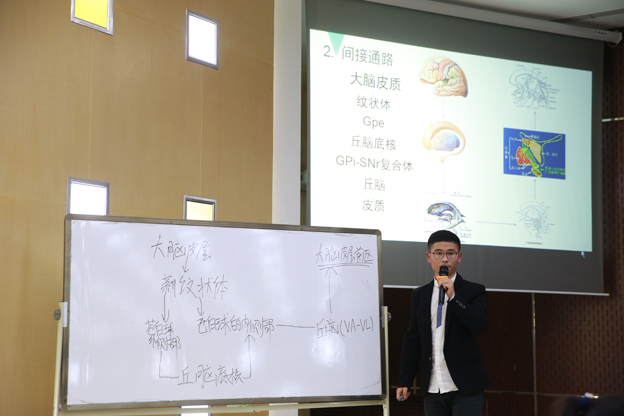 本次比赛共有1300余名同学报名参加,经过初赛、复赛的层层选拔,最终尚医队、飓风队、杏林队、医路有你队四个团队进入了决赛。决赛采用PBL模式竞赛,分为PBL讲学和抢答两个环节。在PBL讲学环节,四个团队对一个由于运动障碍而生活质量下降的老人的病历进行分析,讨论与本案例有关的解剖学、生理学、病理学等基础知识。每个小组派出代表在台上为大家讲解本组对此案例分析的结果和对案例的独特见解。其中,飓风队从与本案例有关的解剖学基础角度分析,运用病理学知识来讲解帕金森的发病。团队运用大量专业知识剖析病历,并画简图分析讲解,吸引了评委老师和同学们的眼球,台下响起阵阵掌声。