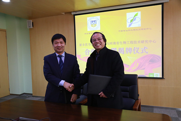 在热烈掌声中,双方领导签订了合作协议并共同为“河南省生物工程技术研究中心新乡医学院三全学院研究基地”揭牌并合影留念。