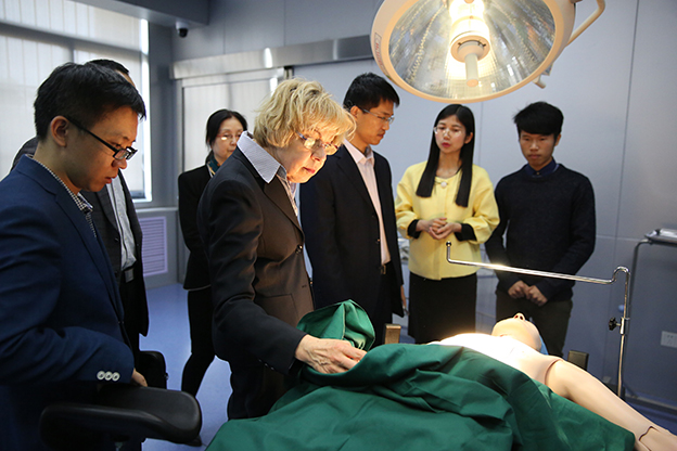 会后,Vonhoff等人先后参观了学院数码互动实验中心、书院功能区、国际护理培训中心。在国际护理培训中心,15级护理专业贺笑颖等学生熟练的心肺复苏术及静脉输液演示获得了来访人员的一致好评。