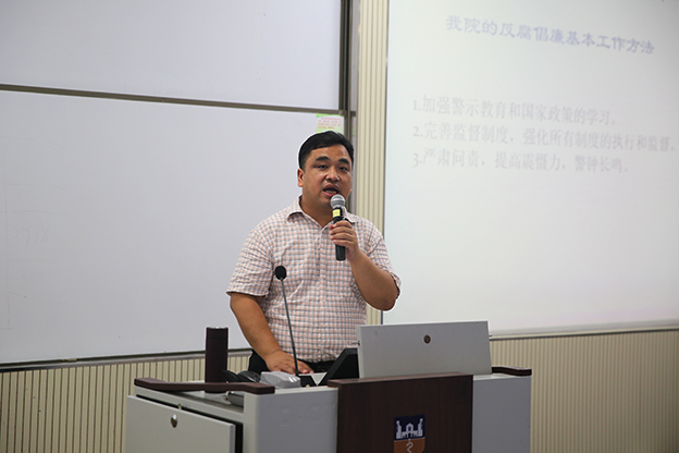 为深入贯彻落实中共中央《建立健全惩治和预防腐败体系2013-2017年工作规划》以及《中央纪委、教育部、监察部关于加强高等学院反腐倡廉建设的意见》,进一步推进学院党风廉政建设和反腐败工作,提升学院行政工作人员廉政风险防范意识,6月30日上午,我院党委副书记张钢在平原校区谨学楼B201教室为全院行政人员做《廉政风险教育》专题教育讲座。