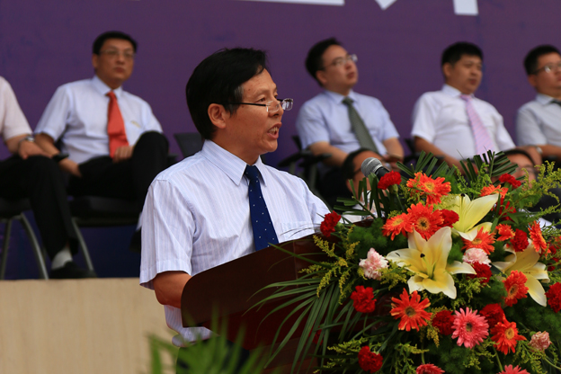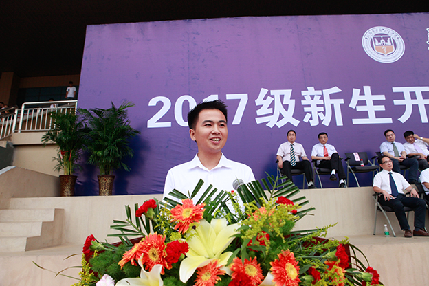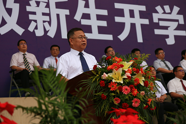 杨捷向2017级新生致辞。他对来自全国17个省、直辖市、自治区的2017级5293名本、专科新生到来表示祝贺和欢迎。他说,开学典礼好比新生和学校的签约仪式,从此大家与学校荣辱与共、紧密相连,学校将忠于育人的使命,努力为同学们的成长提供良好平台。