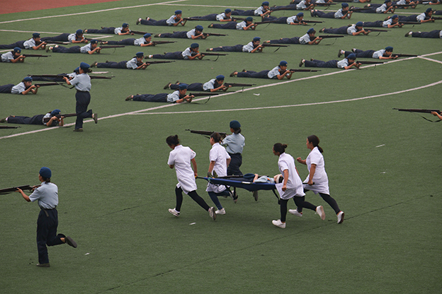 首先进行2017级新生军训汇报演出。720名新生人体方阵在体育场中央迅速组成“2003-2017”“ 三全””等字样,象征学校走过的十四年光辉历程。随后是五个书院进行分列式方阵表演。经过部队教官严格训练,各书院新生在短短的十天里,出色完成了跨立、齐步走、正步走、分列式等预定训练科目。他们以饱满的精神、整齐的队列、响亮的口号、磅礴的气势走过主席台,接受学院、部队领导的检阅。在书院特色方阵表演中,崇德书院男子军体拳腿脚迅捷、出拳有力,女子洗手操则步伐轻快、整齐从容;德馨学子军歌嘹亮,现场拉歌气氛热烈,释放出饱满的青春活力;仁智书院的男子捕俘拳刚劲舒展,腾挪有力;精诚学子歌声激荡,医学生誓言铮铮回响;在战火硝烟中,羲和书院的女子战术表演队形象展现了持枪冲杀、有序布阵、担架救援等紧张激烈的战斗场景,队员们训练有素,身手敏捷,动作行云流水,给观众带来强烈的视觉冲击。此外,承训教官展示的队列科目更是赢得了全场热烈的掌声。整场汇演就是一部国防教育的大片,展现了全院师生坚决跟党走、喜迎十九大的精神面貌。