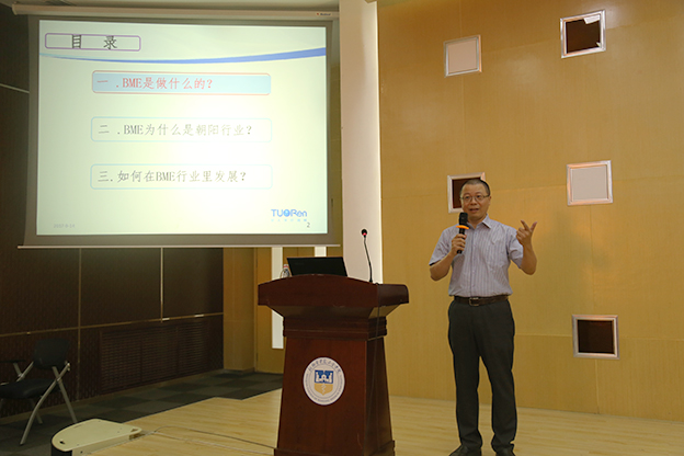 随后,曲浩博士对受聘为我院兼职教授表示感谢,并以“生物医学工程——永远的朝阳行业”为题为我院师生作专题讲座。曲浩博士根据自己多年的从业经验,生动的讲述了生物医学工程的前世今生以及光明的发展前景。曲博士语言诙谐,讲授内容深入浅出,赢得了在场师生一次又一次的热烈掌声。在交流环节中,与会人员积极发言、踊跃提问,曲浩博士对本专业今后就业方向和学习深造等各方面问题进行了认真回复,坚定了同学们的专业信心,并表示欢迎我院学生到其公司就职。