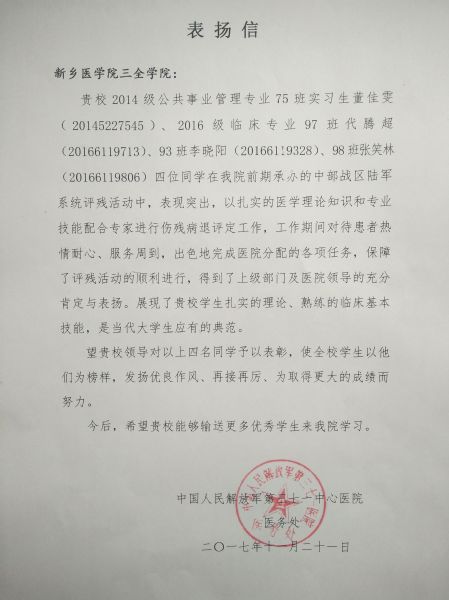 近日,我院收到来自中国人民解放军第三七一中心医院的表扬信,对我院公共事业管理专业实习生董佳雯,临床医学专业见习生代腾超、李晓阳、张笑林等四位同学在实习、见习过程中的优秀表现给予高度赞扬。