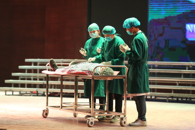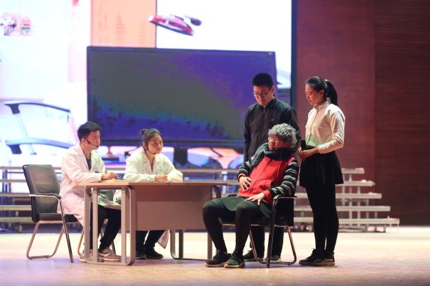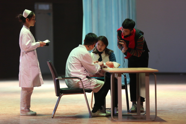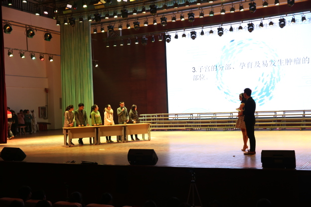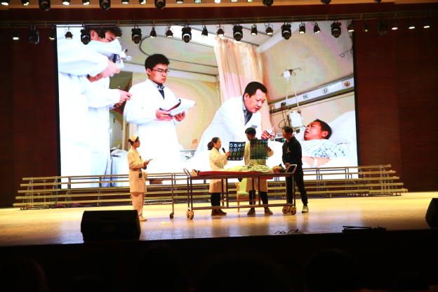 本次比赛对象为2016级临床医学专业卓越班全体学生,经过层层选拔,最终有六组学生进入决赛,决赛分为情景剧表演和临床知识抢答两个环节。情景剧分别从不同的视角向观众展示这个平凡、辛劳却又伟大的医生群体。第一组的《杏林春暖》一剧,将医患的矛盾焦点加工成形式多样、内容丰富的情景剧。展现了全科医生的沟通能力及技巧。第二组的《父亲》一改观众眼中医生“高冷”的形象,以小爱见大爱,体现医患间的浓浓情谊,浓浓真情,令人潸然泪下。第三组的《那年花落,花开》幽默风趣,贴近生活。讲述了脑炎患儿家长对医生的不信任,对检查的顾虑,给及时有效治疗带来了障碍,但经过医护人员的不懈努力,终于得到了患儿家长的支持和理解。演员们的表演精彩纷呈,掌声欢呼迭起。第四组以“高血压脑出血“为蓝本”带来的舞台剧表演《医路同行》也赢得了台下的阵阵掌声。第五组由宫外孕为病例进行的舞台剧表演《宫斗》,清晰的表现了医患纠纷在现实中非常普遍,但这需要医生与患者之间相互理解,充分信任,及时沟通,才能构建良好的就医格局。最后一组《相信医生》以鲜活的画面,生动的情节,通俗的语言,将医务人员耐心、细致、亲切,家属猜疑、焦躁等形象表演得惟妙惟肖,令在场医学生们感同身受。整场比赛松紧有秩。专业的手法,细致地讲解令全场比赛高潮迭出,精彩纷呈,不时赢得现场观众的热烈掌声。