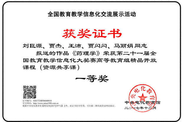 据悉,本次全国参赛作品5641件,其中高等院校、中职参赛1980件作品中134件杀入决赛,我校有5件作品进入决赛。在北京决赛现场,经过技术测试、现场讲解展示和专家提问答辩后,我院药学院刘巨源老师的精品开放课程《药理学》、基础医学院王秀菊老师的精品开放课程《医用化学精品课程》、护理学院张一莉老师的微课《宝宝发烧后的处理》、教育技术中心赵俊强老师的微课《大学职业规划》、基础医学院金白洁老师的微课《神经-肌接头处的兴奋传递》作品全部通过答辩荣获一等奖,其中张一莉老师被邀请在全国颁奖典礼上作为典型代表展示汇报。