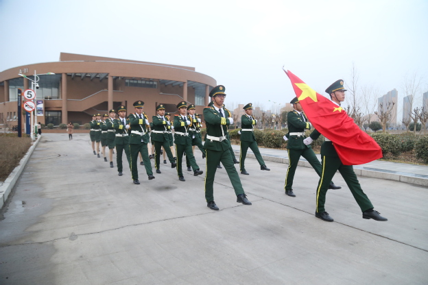 6点55分,升旗仪式正式开始。在全体师生的注目礼下,英姿飒爽的国旗护卫队队员护送鲜艳的五星红旗向升旗台踏步走来。7点整,伴随着庄严的《义勇军进行曲》,五星红旗冉冉升起,迎风飘扬,全场师生行注目礼,怀揣成为“有理想,有本领,有担当”的优秀青年的青春梦想,不忘初心,牢记使命,以优异的成绩向祖国献礼。