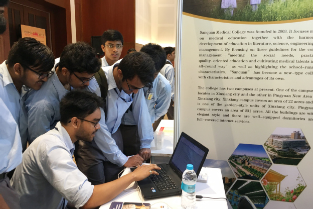 展会期间,在河南省教育厅教育代表团团长陈兆武的陪同下,马占武总领事前往我校展台参观,与我校教师代表亲切交谈。教育展协办方加尔各答中文学校董事长马丹·萨拉夫、校长萨凯丽前往我校交流,了解我校宣传情况,我校教师代表与加尔各答中文学校代表交流学校简况及专业开设情况,沟通双方合作意向。展会期间,我校精彩的宣传视频, 设计精美、图文并茂的英文宣传材料吸引了近千名家长学生前来咨询,据统计,我校共发放宣传材料600份,共有近100名学生对我校医学专业有着极大的兴趣。